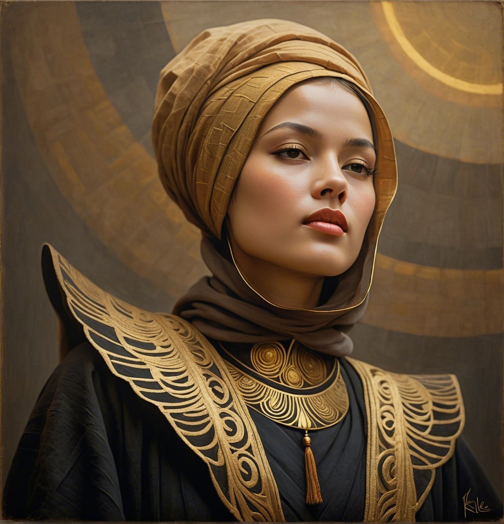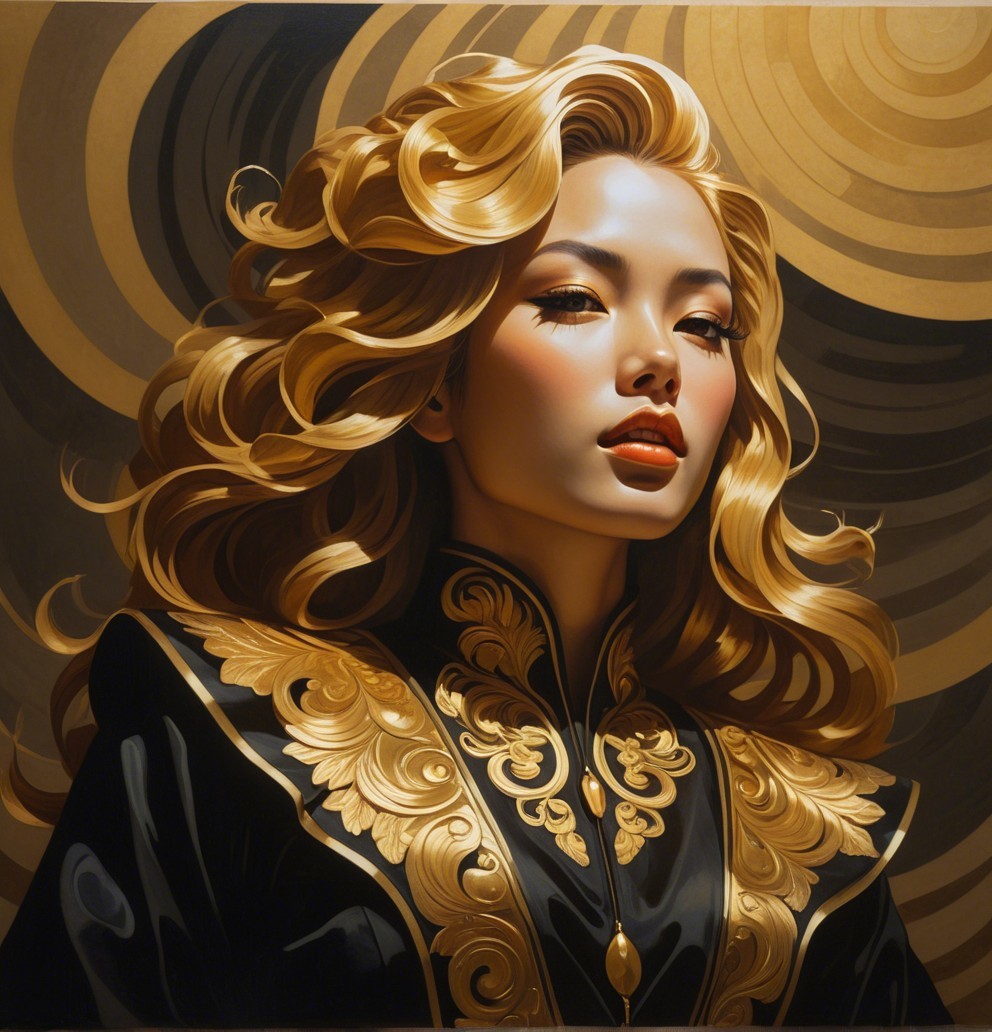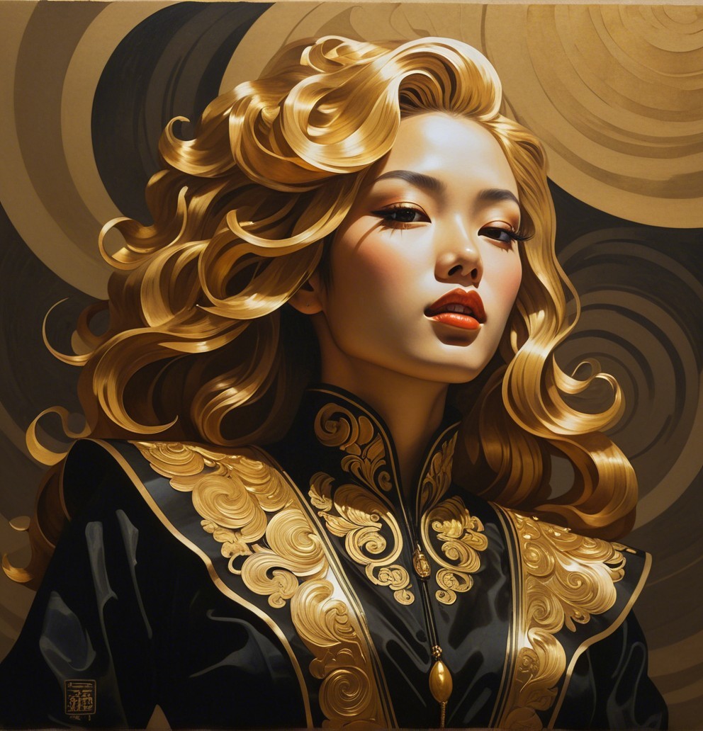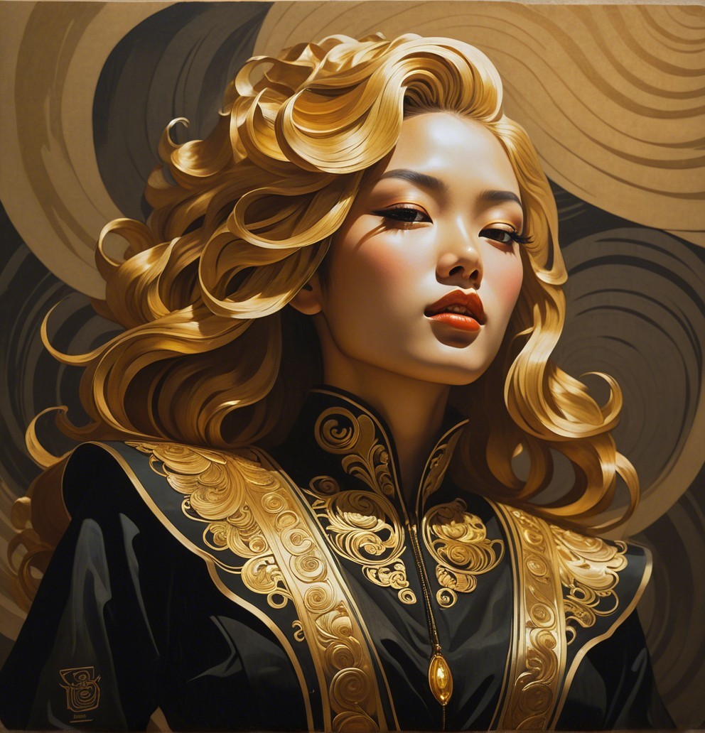 Prompt: Stylized woodblock print, dark fantasy art, golden rim lighting, otherworldly, stylized Portraiture with stacked-up perspective, flowing hair illusion, tousled, sexy, swirly, sun rays,ominous light beams, bright golden lighting, anisotropic filtering, shadow mapping 1.3, volumetric lighting, gouache on rice paper, alcoholic inkpunk by nam yune paik, auracore, raytraced shadows1.8, fantastical, mystical, brightness 1.4, erotic essence, overall composition by Georgia o'keffee and William Bradley and Barclay shaw,coherent lineeage with thick strokes, rounded edges, 3 layers of dof, juvenile woman with golden filaments, waves,misty, figurative style of Paul Klee, hues in style of Egon Schiele, brushstrokes in style of Rennie Macintosh, mysterious solitude, smooth lines, deep browns, celestial style, warm brushstroke fields, reminiscent of watercolor & ink, warm coloring, anthotype print technique, overall composition by Georgia o'keffee and William Bradley and Barclay shaw, stippled, abstract cubistic features in wet-on-wet, american gothic 1.7, close-up, high coloring 1.8, sculpted, baroque, Unity Render Texture, multi-textured and layered, bas relief elements, erotic, Color palette is rich jewel toned colors, beige, golden, brown, chrome & graphite, warm colored and designed patchwork in textiles & background ,Structured divisionism, interplay of darkness and light,colored by Mike savad, octane render illustration 1.5, subtle, golden ratio, fauvistic fractalization, dark fantasy art,