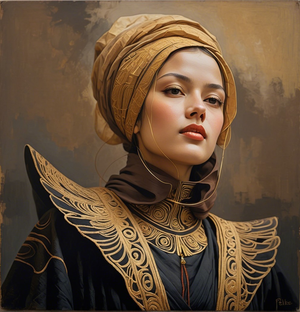 + Prompt:Stylized woodblock print, dark fantasy art, stylized Portraiture with stacked-up perspective, lineeage with thick strokes, rounded edges, 3 layers of dof, juvenile woman with long brown robe, golden filaments, waves,misty, warm shades of Auburn and pale brown, serene expression on her delicate face, luminosity1.9. Watercolor wash, soft Auburn and ochre hues of the fading horizon, ethereal and mesmerizing in the style of Barclay shaw and william Bradley, abstract american gothic 1.7, tetradic color scheme brown auburn ochre beige, hues, overall color palette integrates shades of dusky brown, charcoal black, and burnt orange, accented with tints of magenta, giving the image a fantastical, fauvistic depth.,close-up, Handsome long haired priestess, rounded edges, quilling, githucal, delicate coloring 1.8, blurry edges effect rim dynamic lighting, stylized, stippled, (woodblock print (triadic color scheme beige, ochre, black) 8:11), perfect handsface, cottagegore features, vivid illumination, intricate hairstyle), tints of comic book art, 7:11), luminous plasticity, dark fantasy art, 3d effects, anisotropic filtering, 3 layers of dof, dreamscape, advertising art reminiscence, colorful hues, plasticity 1.6, complexion 1.4, brightness 1.9, ambient occlusion 1.5, shadow mapping 1.3, ,raytraced shadows 1.8, sharp, sculpted, retrofuturistic, serene, foampunk, octane render illustration 1.5, illustrative pulp art 1.7, grunge, coherent, stacked-up perspective, charcoal textures 1.7, sci-fi style heroine in style of Georgia O'Keeffe and Susan Seddon Boulet, brightness1.4, complexion, uplifting, plasticity 1.6, luminosity 1.3, raytraced shadows 1.2, gouache paint details,The background has a stylized, deep brown celestial style, warm brushstroke fields, reminiscent of watercolor & ink, intricate, soft delicate coloring, anthotype print technique