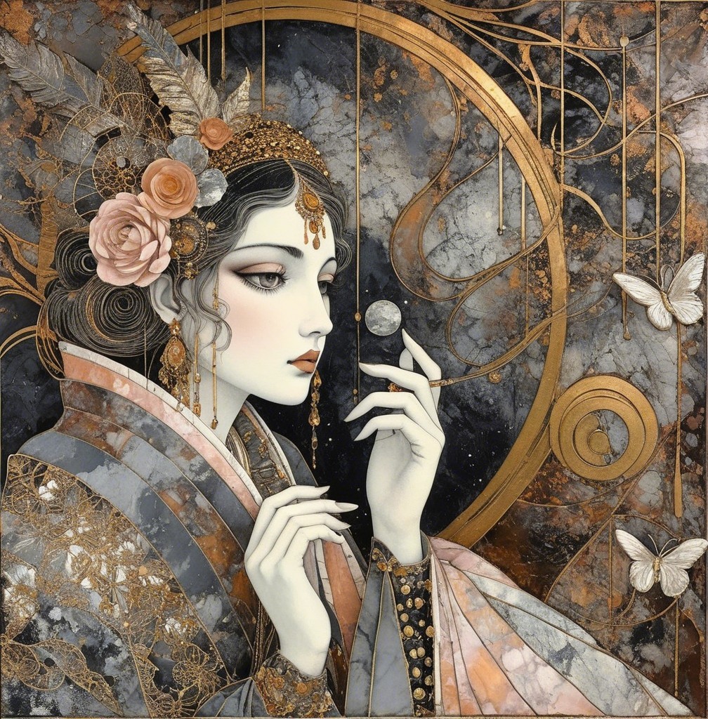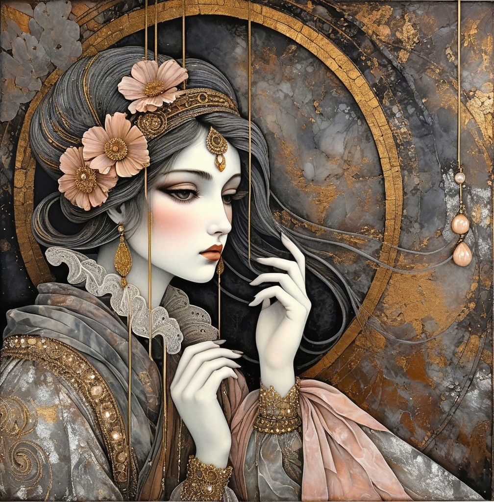 A beautiful woman adorned with flowers and fine jewelry gazes contemplatively. Her delicate features are accentuated by an elegant hairstyle, set against a backdrop of swirling textures and gold accents.