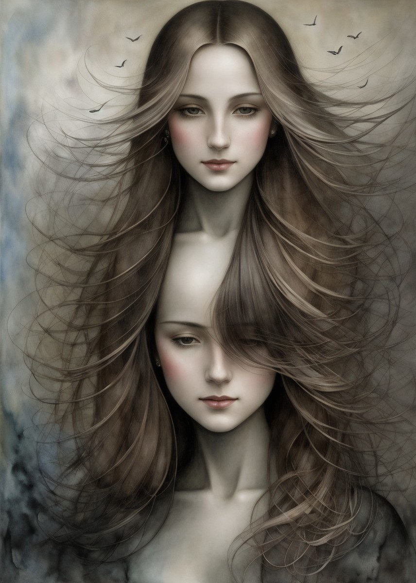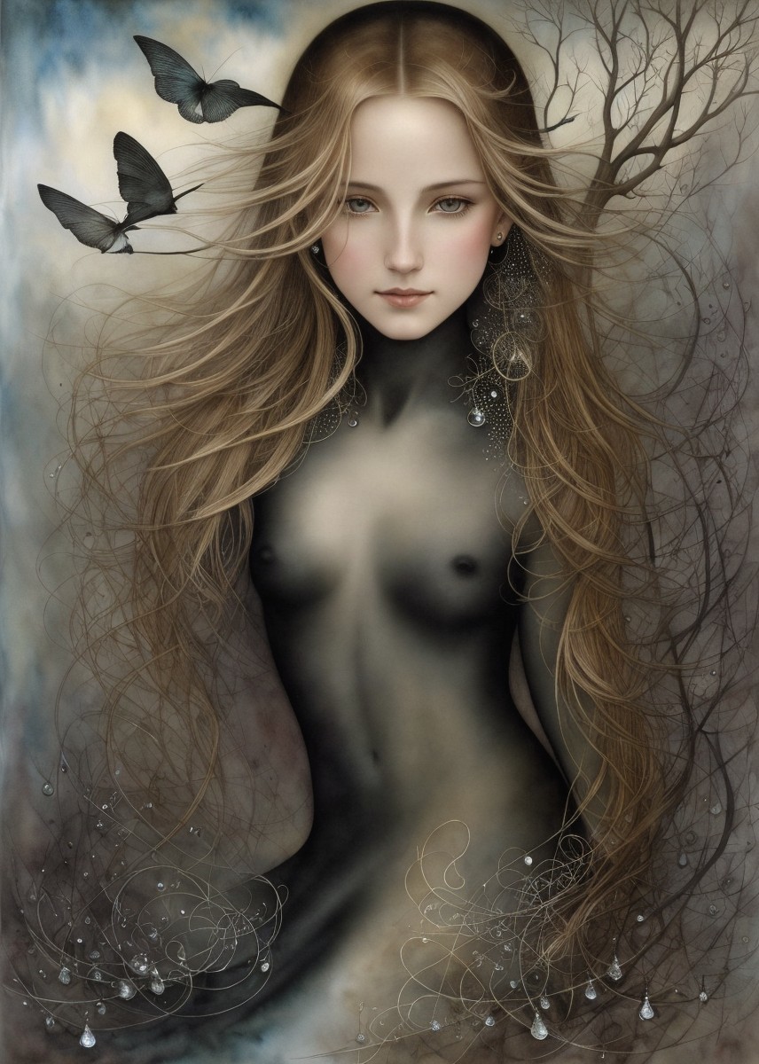 Digital artwork of a woman with long wavy hair, a subtle halo, wearing a sheer drape, with a serene expression.