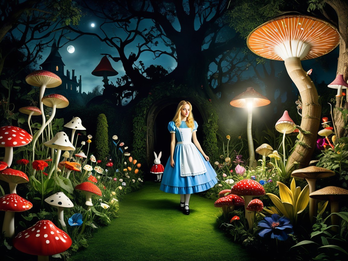 A whimsical scene featuring a girl in a blue dress standing in a vibrant, fantastical garden filled with oversized mushrooms and colorful flowers, illuminated by a magical glow at night.