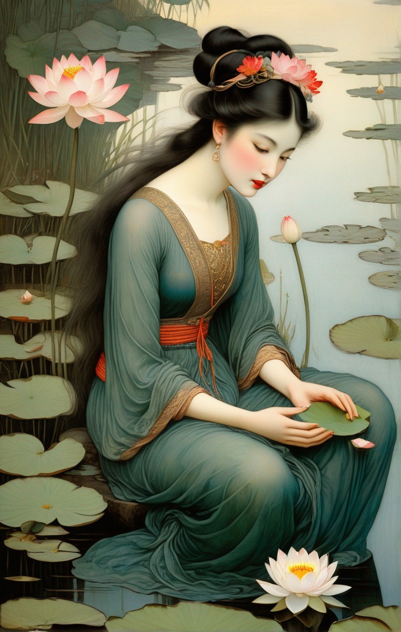 The woman is stunning, resembling a mythical figure emerging from a lake, gracefully gathering lotus flowers. She possesses a deep understanding of her identity and radiates inner beauty. Her eyes captivate with a luminosity reminiscent of a sunrise.