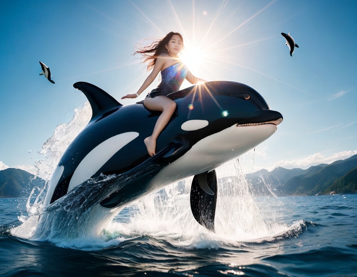 A gorgeous Korean K-Pop star riding on top of a magnificent Killer Whale jumping out of the water in the ocean.