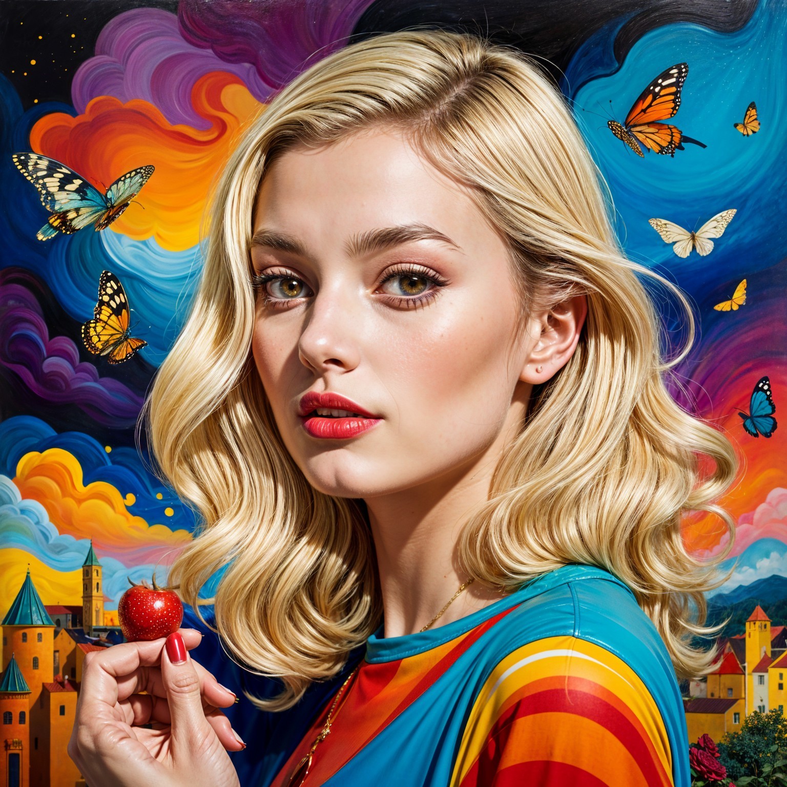 Prompt: Create a vibrant and imaginative artwork Amelie Elmquist aka Amelea 20yo blonde embodied in her iconic persona she is holding a single strawberry. The painting should be inspired by Salvador Dali's surreal style, incorporating intricate details and dreamlike elements. The background should be fun and whimsical, filled with unexpected shapes and playful colors that enhance the piece's fantastical atmosphere. Aim for a high level of detail that captures the essence of both Amelie Elmquist aka Amelea's glamorous style and Dali's unique approach to art.