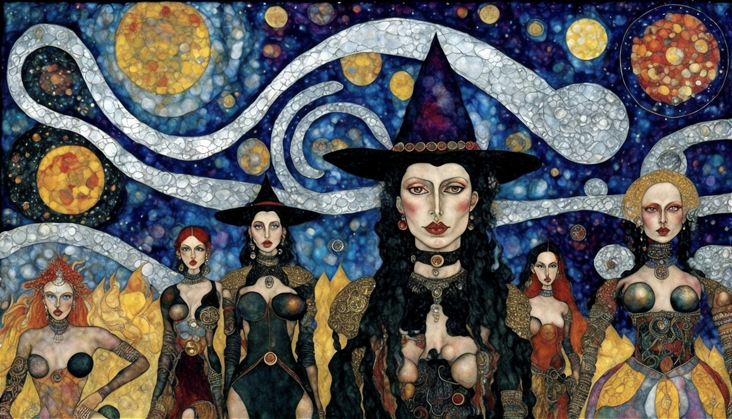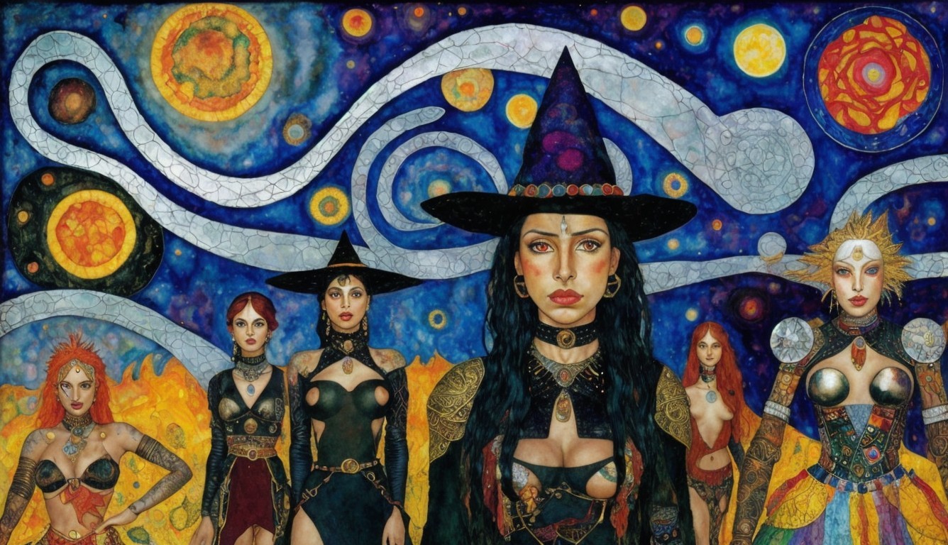 Stylized witches with unique hairstyles in cosmic setting
