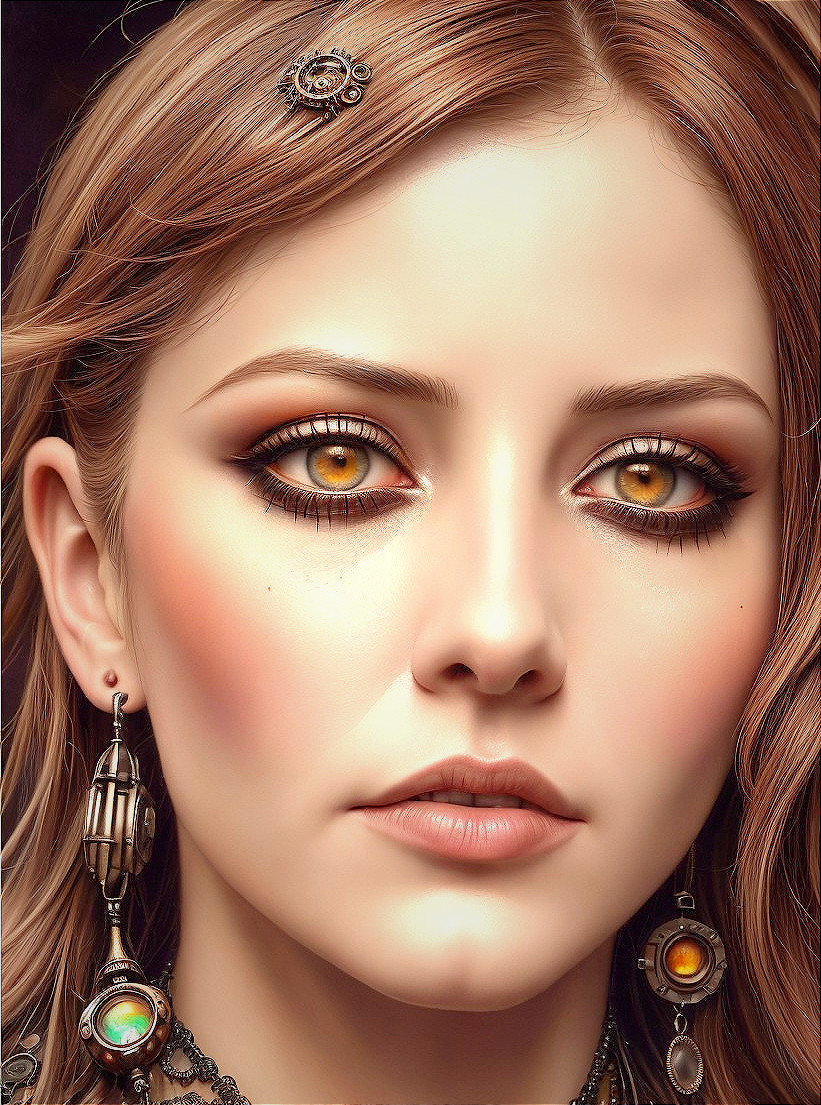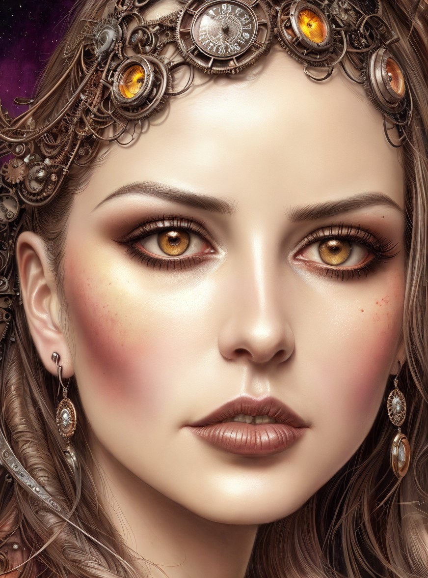 watercolor and ink portraiture, realistic brown eyes, chaotic rim background, retropunk contraptions, 3d effects, dynamic lighting 1.7, chiaroscuro lighting in background, ornamental details, occult, retrofuturistic art, withered pale colors, intricately detailed, gothic fantasy 1.7, back-lit, dimmed lighting, art nouveau, (steampunk (triadic color scheme pink, ochre, brown) 6:11), inkpunk, surreal background by Ho baron, perfect handsface, ornamental details in vibrant colors, very detailed, (gouache details, strict pose, (bkue background with tints of Margaret Keane, (vivid illumination, intricate surrounding 7:5), tints of 1970s advertising art) 15:11), detailed iridescence, grain, mezzotinto, luminous plasticity, anisotropic filtering, hues, plasticity 2.3, shadow mapping 1.7, volumetric lighting, daguerreotype photography style on old paper,, auracore, anglocore, retropunk, auracore 1.7, synthetic, spiritual essence, 1970s movie poster art, ambient occlusion 1.5 , american gothic 1.7, tints of space age art, geometrical illustration, soft edges, stylized, jewelry details