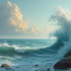 A dramatic seascape features a powerful wave crashing against rugged rocks. Soft clouds drift above, illuminated by warm sunlight, creating a tranquil yet dynamic coastal scene.