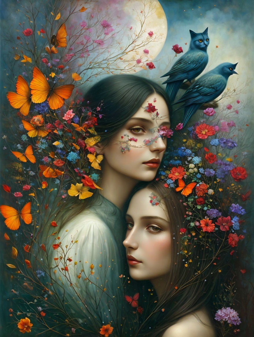 A vivid artwork of two women surrounded by colorful flowers, butterflies, and birds, with a fantasy, ethereal atmosphere. Inspired by a picture of P H B, using my own base.