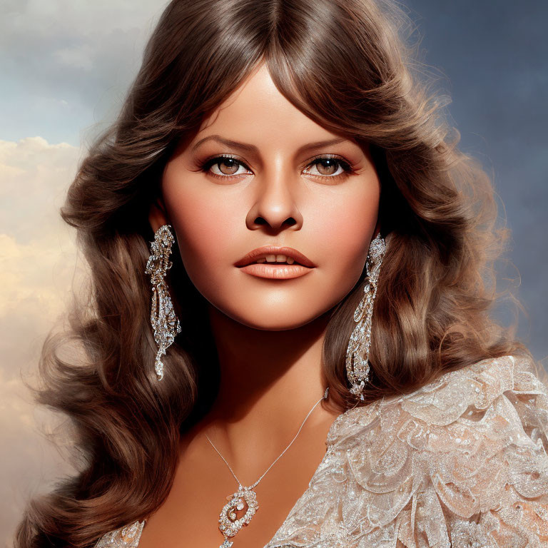 Woman with Voluminous Hair and Striking Makeup in Sparkling Earrings and Necklace