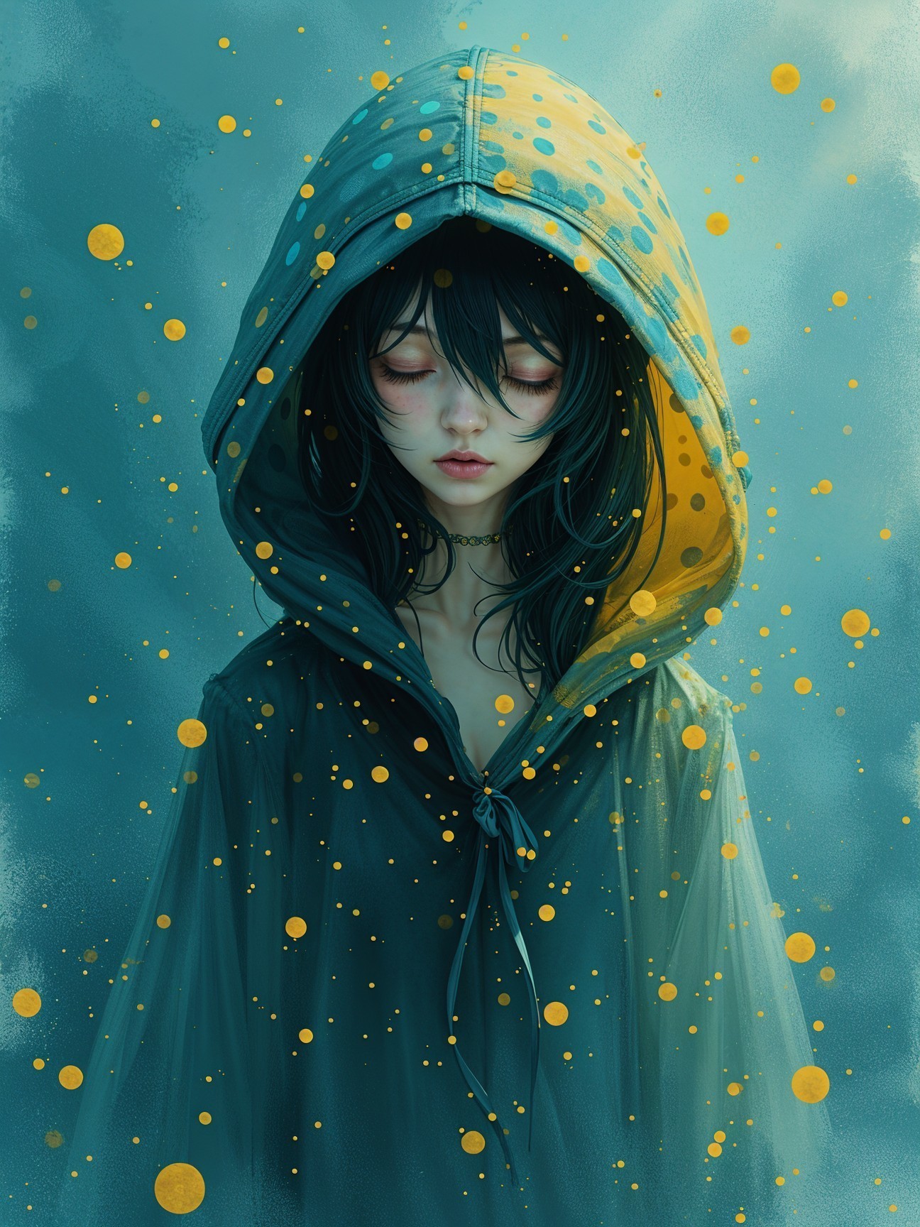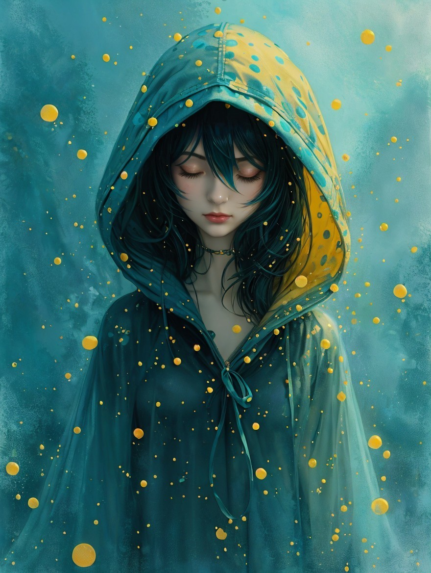 A serene figure in a polka-dotted hooded coat stands against a dreamy background. Soft colors and floating orbs create a mystical, ethereal atmosphere around the contemplative character.