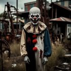 A sinister clown stands in a dusty street, adorned in a ruffled collar and colorful attire, with a hot air balloon floating in the background under a dramatic sky filled with clouds.