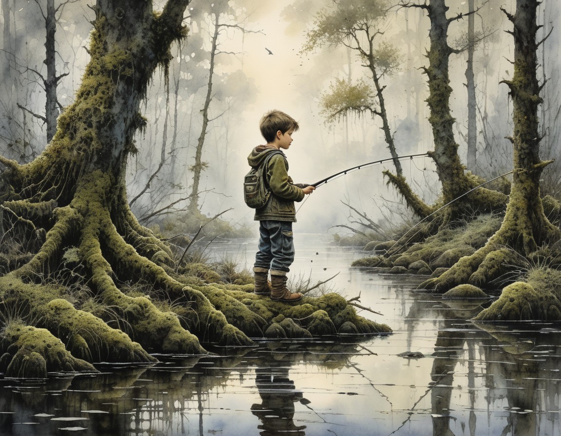 A child fishes in a serene, misty swamp with moss-covered trees and a glowing sun in the background.