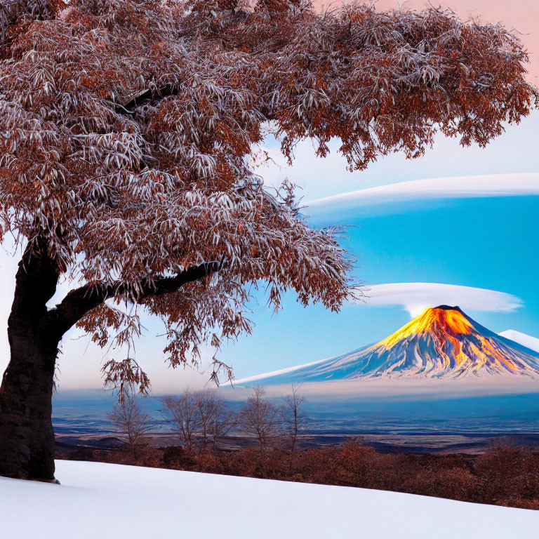 Winter scene: Snow-covered tree and frosty branches with distant mountain peak at dawn