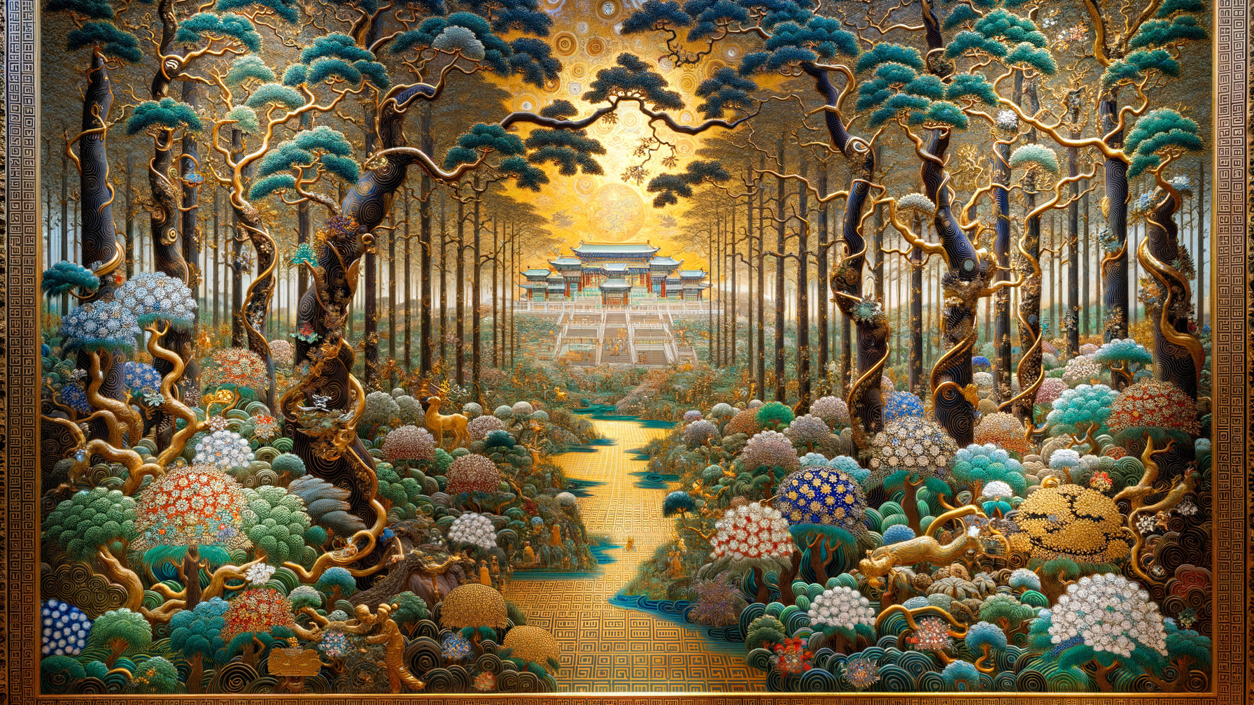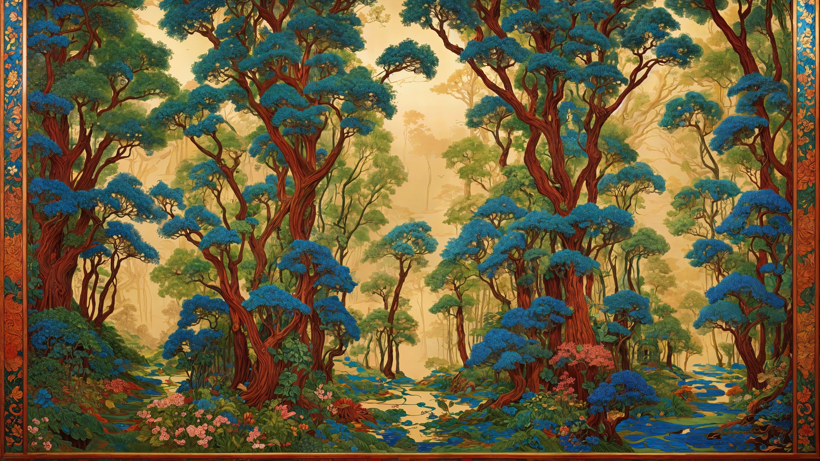 The image features a vibrant mural with stylized blue trees against a golden background, complemented by lush green foliage and colorful flowers at the base, creating a serene and artistic landscape.