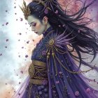 Portrait of Izanami-no-Mikoto, the Primordial Creatrix and Eternal Queen of Yomi, fully clothed in ornate ceremonial death-empress armor, standing in commanding presence at the threshold between creation and decay. Her majestic yet tragic presence radiates both divine beauty and inevitable entropy, her elaborate ceremonial armor-kimono crafted from the fabric of reality itself - living shadow-silk interwoven with ossified starlight and preserved chrysanthemum petals, completely covering her figure. Ancient kanji of creation (sei) and death (shi) flow across her full-length empress dress-armor in luminous script that shifts between divine gold and necrotic purple, spelling out the fundamental truth that all things born must return to Yomi.