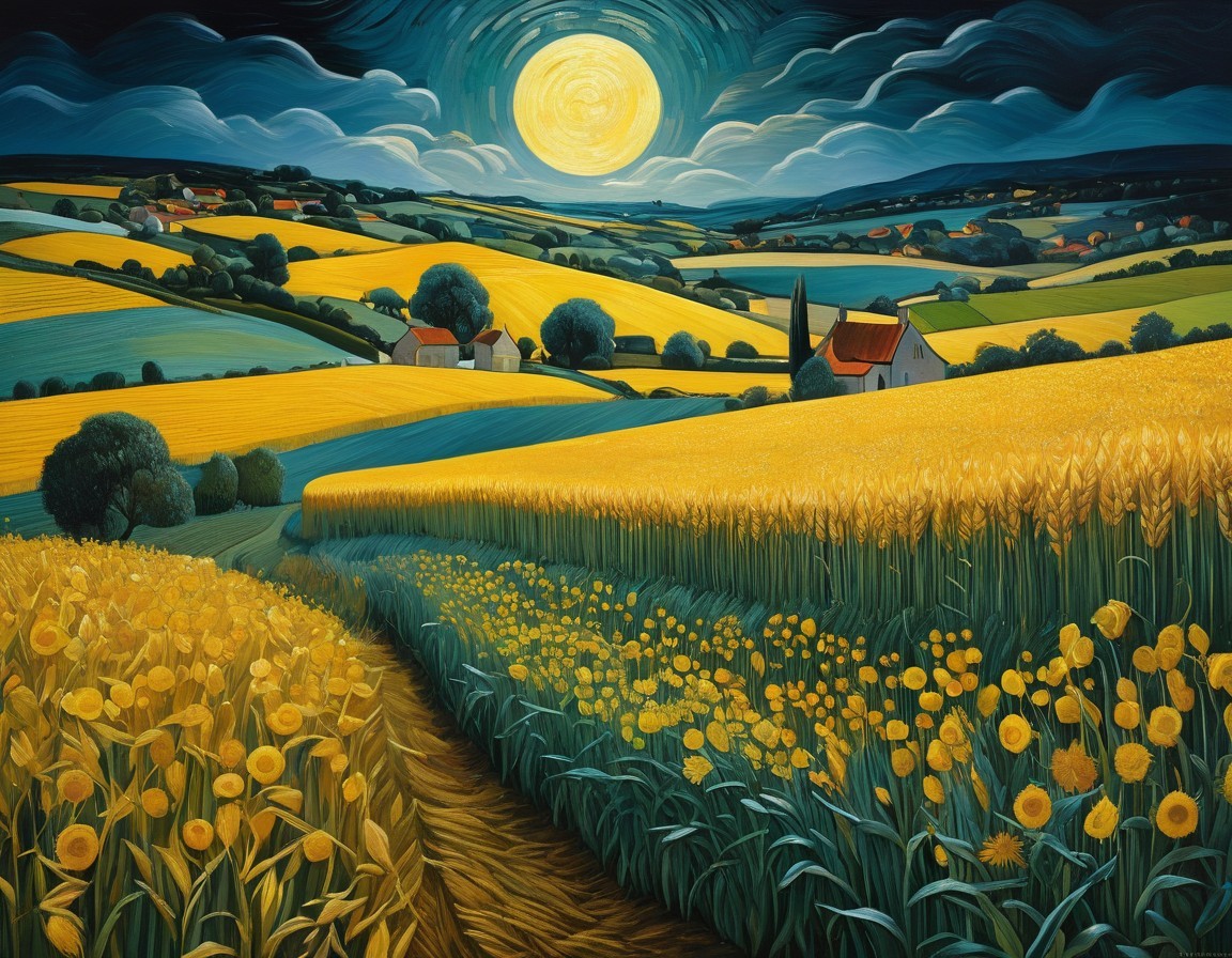 Stylized rural landscape painting with full moon, golden fields, houses, and starlit sky