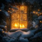 A cozy winter scene with a window overlooking a snowy landscape. Soft candlelight glows amidst snow-covered branches, creating a warm, inviting atmosphere in the frosty ambiance.