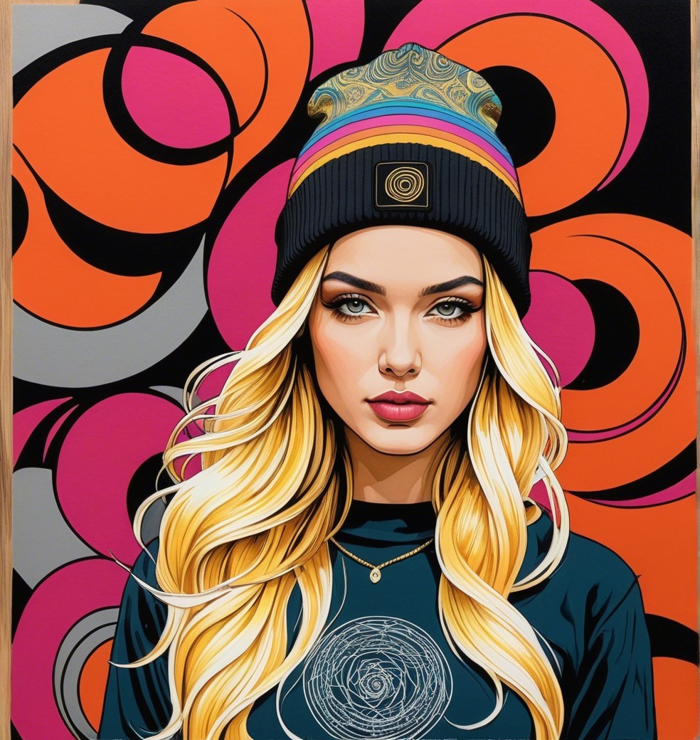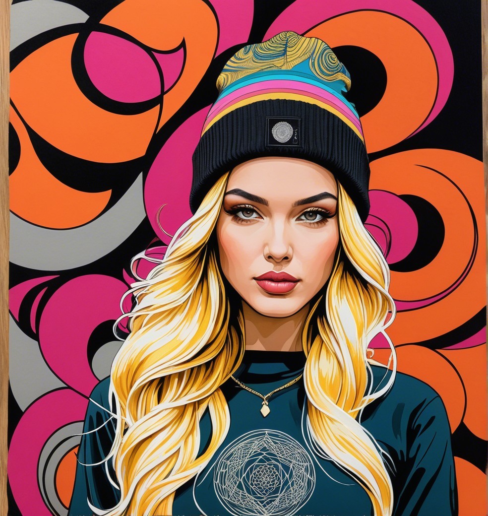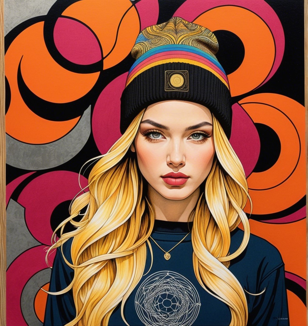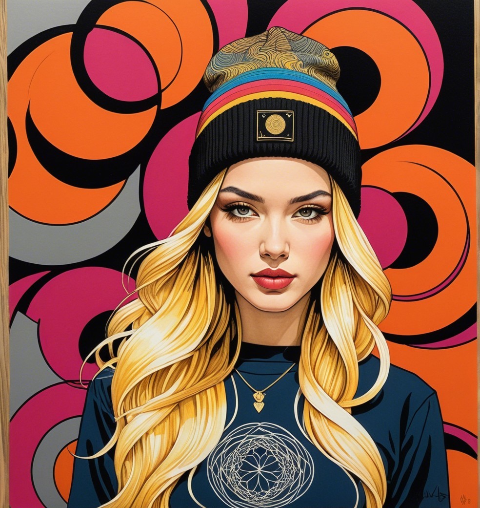 Portraiture in pen and ink, enchantress with beanie, golden ratio, drawn with colored ink, flowing lines. Lineage art, Multicolor woodblock print, mokuhanga style. Ukiyo-e, acrylic art, 3 point lighting, illuminated ink and pen, glossy, spectacular, highly detailed, grungy, style of david graeme Baker, juvenile, trans-Avantgarde merged with foampunk, parallax occlusion 1.2, reminiscent of sgraffitto style, contouring outlines, vibrant pastel coloring, stylized lineage drawing with calligraphic outlines by William Bradley, baroque, cel-shaded, somber baroness, raytraced shadows 1.2, elegant, rule of thirds, jewels, adorned with silver necklace and revealing attire, tonalism, woodblock print, stylized Portraiture by Hope Gangloff, ho baron, Viktoria Gavrilenko, Hoang Lap, Karol Bak, stan lee, mysterious, stacked lines, squiggly line-art, 3d effects 1.8, collage-style, hues by Georgia O'Keeffe,raytraced shadows, serene temptress with devilish eyes and tousled blonde hair, tesselated, meaningful bust of blonde hair, flowing hair illusion, crisp quality, headshot, Raytraced shadows 1.8, shadows, high contrast, relaxing ambience, soft lighting, warm soft soothing pastel tones, crisp quality, Pencil and ink alcohol ink, Dappled gaze, beautiful fantasy , warm coloring, reminiscent of pop art, blurry reflections, shadow mapping 1.7, primary colors, stencil style, anisotropic filtering 1.7, stippled, sculpted, marinism, stivolism, pencil sketch style, dynamic lighting 1.2, coffinwood 1.7, hues of pencil sketch, internal joy, serene expression, veined skin, crackled texture, polished, concept fusion, modern, intricate, fractal patterns, muted colors, optical illusions, close-up, blurry edges effect, eroticism, nuanced, lavish, grunge, coherent, otherworldly, gradient color inking, Comic book art merged with pulp art reminiscent of book cover art by Frank Fazetta, harsh lighting, luminism, tiny paint strokes, three-dimensional effect, stippled, uhd hdr, 64K, octane render,