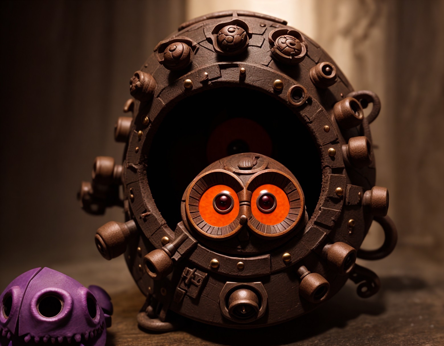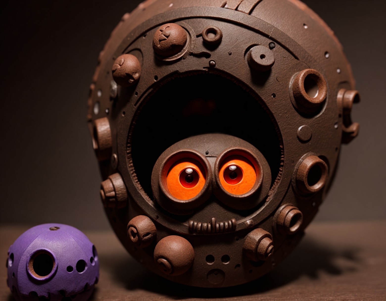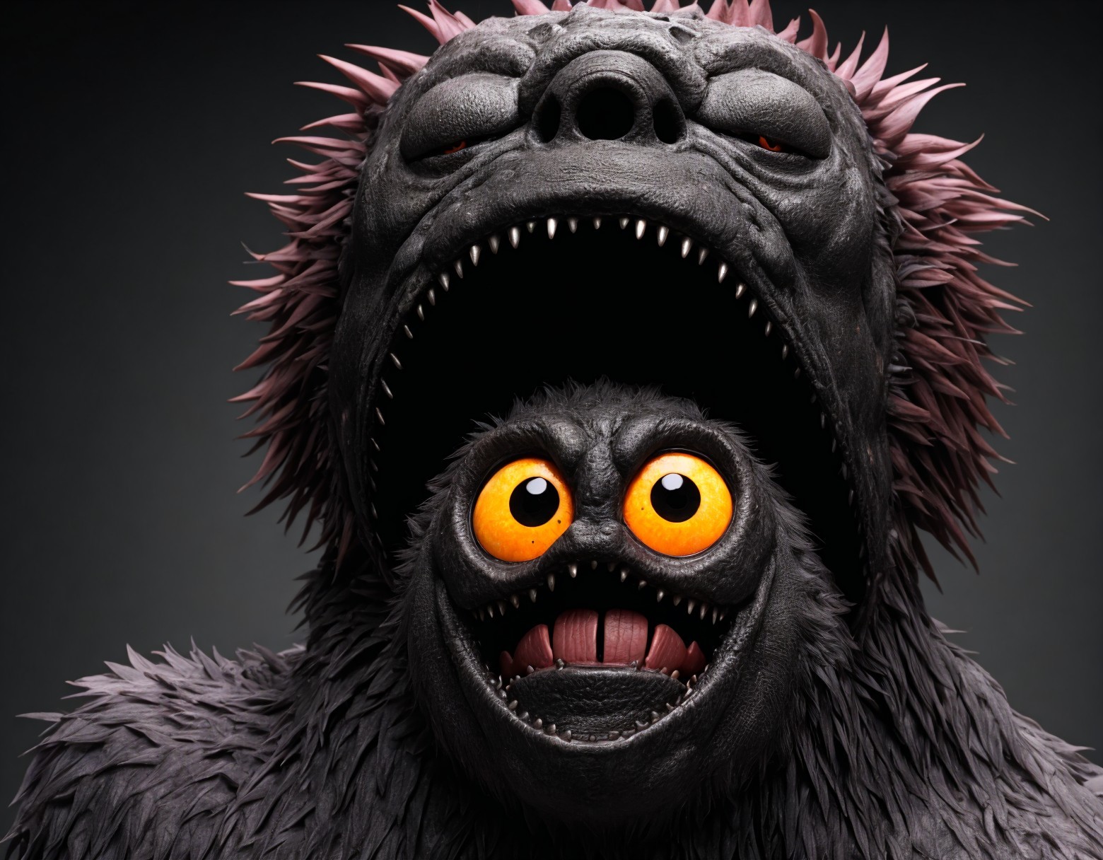 A large dragon looming over a smaller creature with wide, orange eyes and a startled expression. Both have dark, scaly skin.