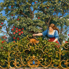 + Prompt:Golden garden gate with forged tendrils and leaves, a middle-aged woman with brown medium-long hair and a blue dress with red patterns looks down and works on the bushes, one small cat, behind it a wild enchanted garden, dense flowering bushes, flowers, trees,blue sky, fluffy clouds, inspired by Beatrix Potter