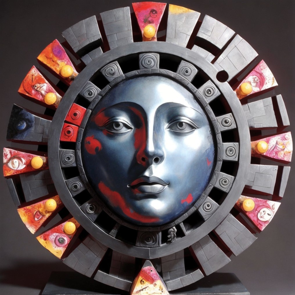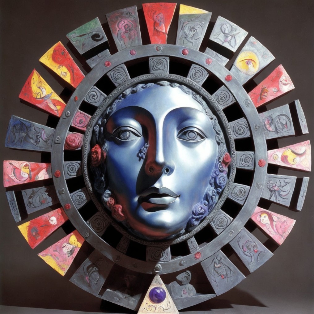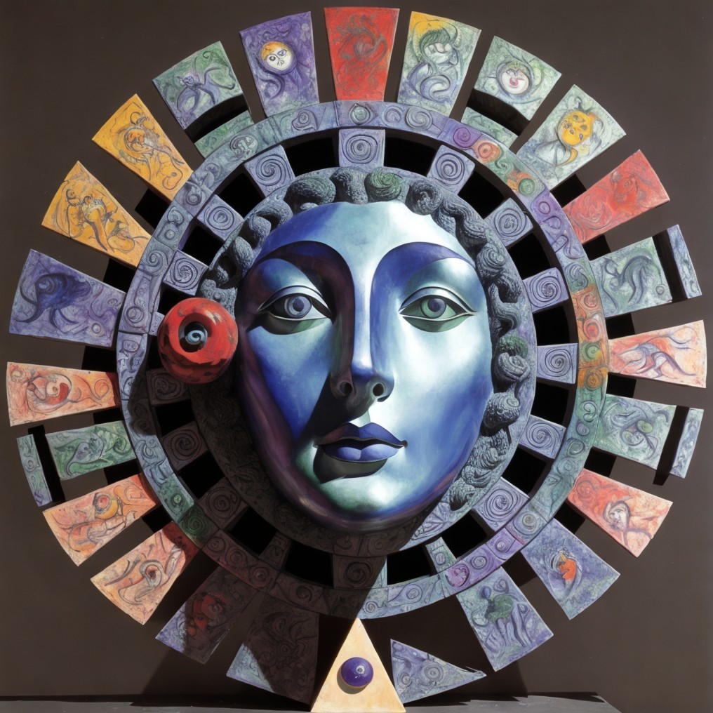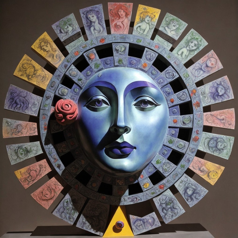 Colorful surreal painting: face with sun halo, pink rose, playing card symbols