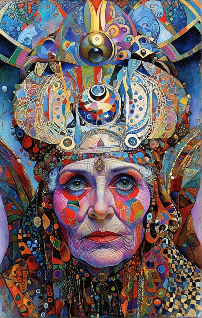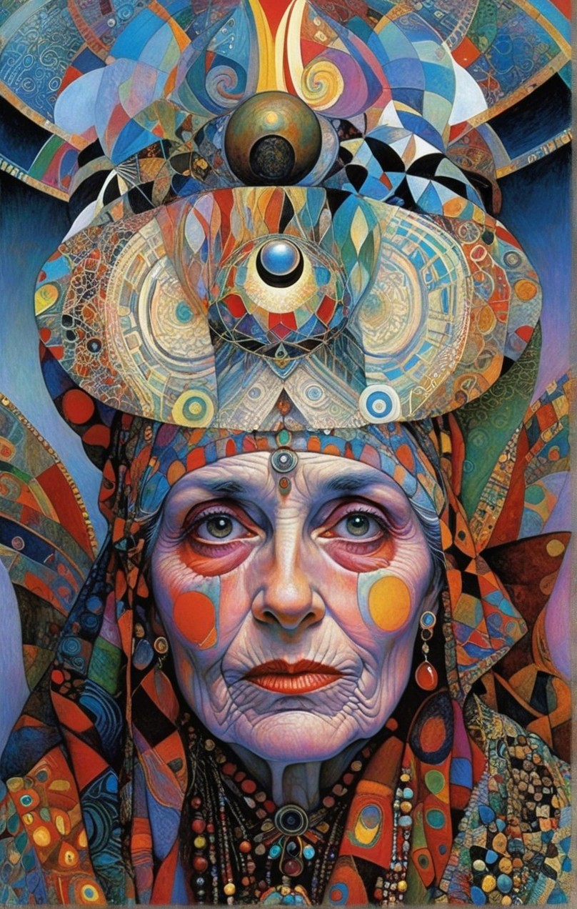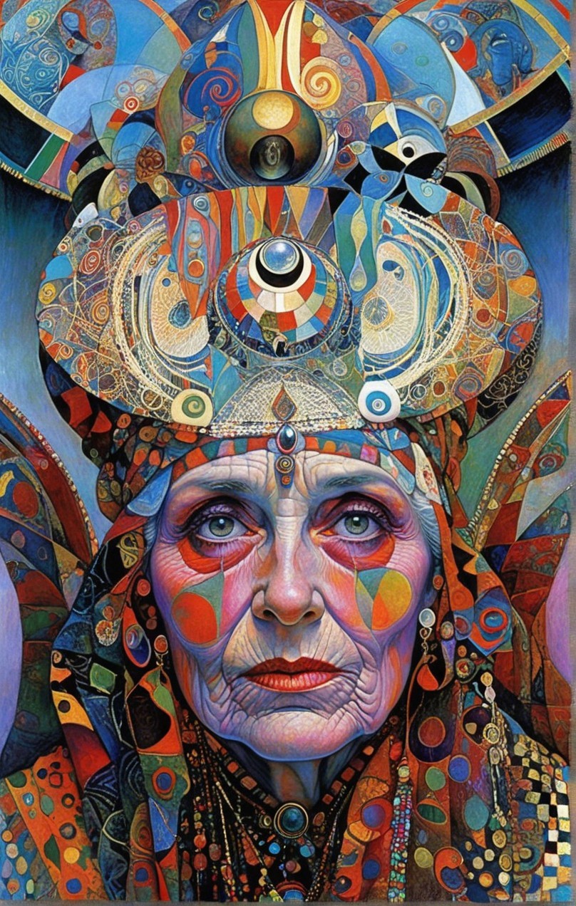 A striking portrait of an elderly woman adorned with intricate, colorful patterns and geometric designs, conveying a sense of wisdom and mystique through expressive features and rich textures.
