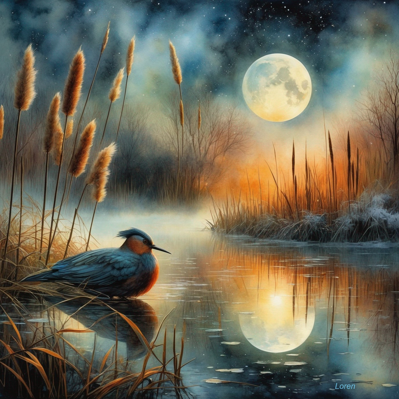 A serene night scene with a full moon reflecting on the water, a bird by the shore, and tall reeds under a starry sky.