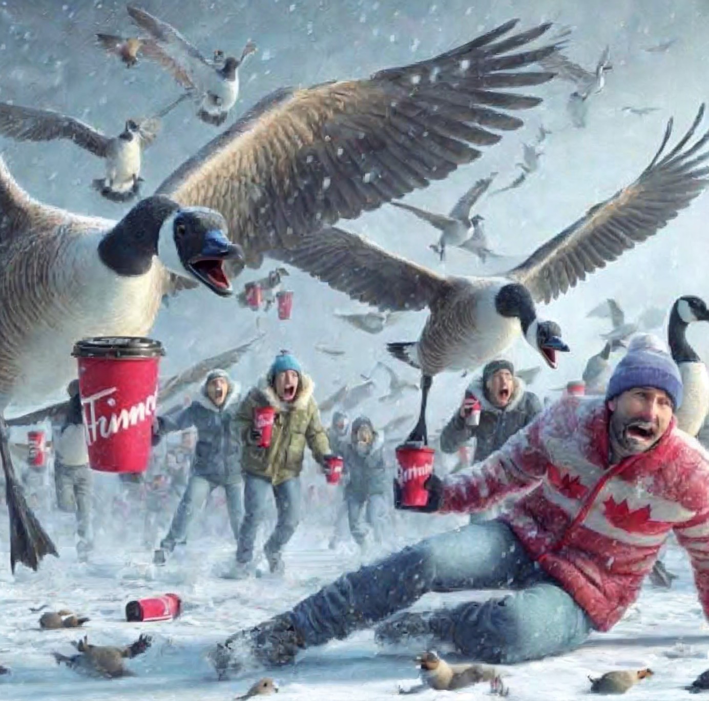 People surrounded by flock of birds in snow, one person with red cup, birds flying, visible excitement