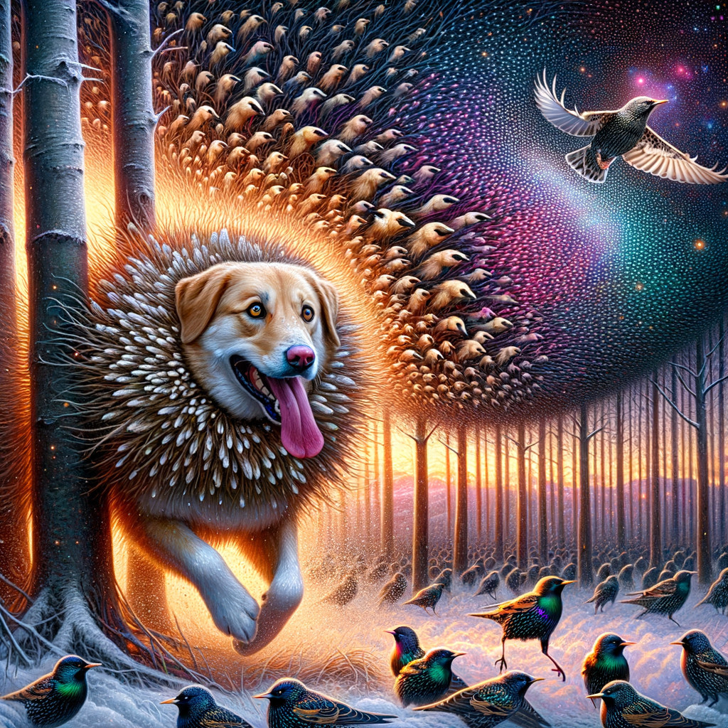 Prompt: "Dog appeared out of the woods, its pink tongue lolling out of him, goose grass tangled around his back leg. From the trees a flock of starlings took off. Maybe they signalled the vixen moving deeper into the woods.