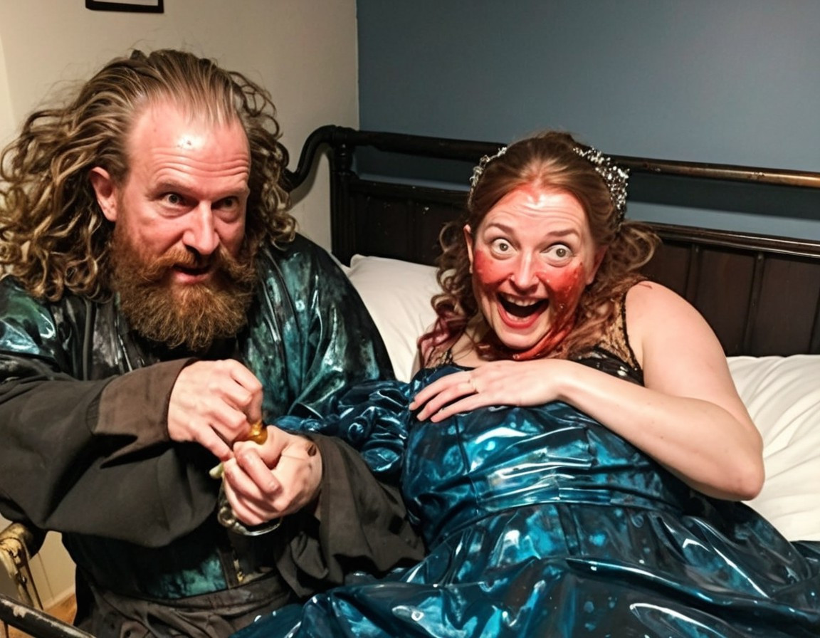 A pregnant woman in a blue dress adorns a bed, water broken, greenish seawater flow, as a man looks on in surprise.