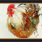 A whimsical artwork features a vibrant bird with a fiery crest and a charming fox nestled among stylized, multicolored leaves, all framed in an elegant border.