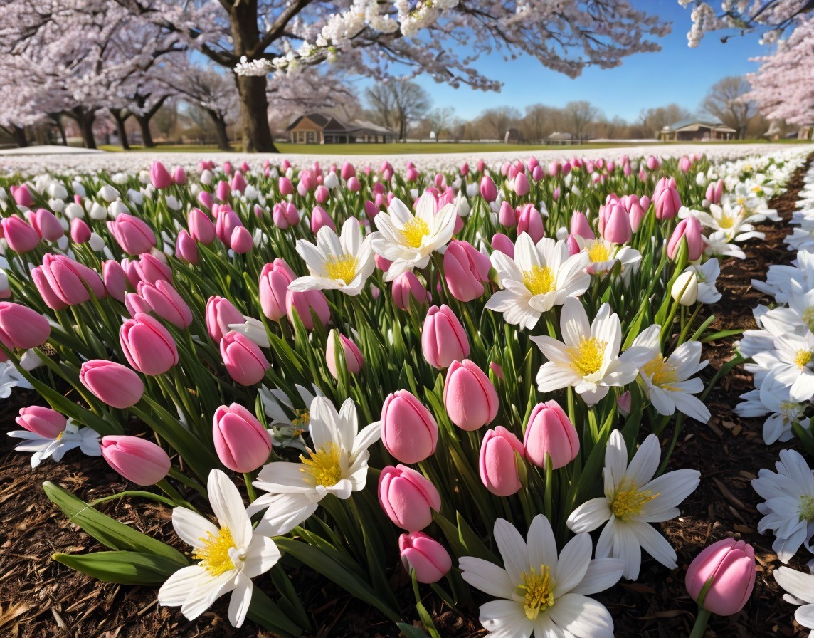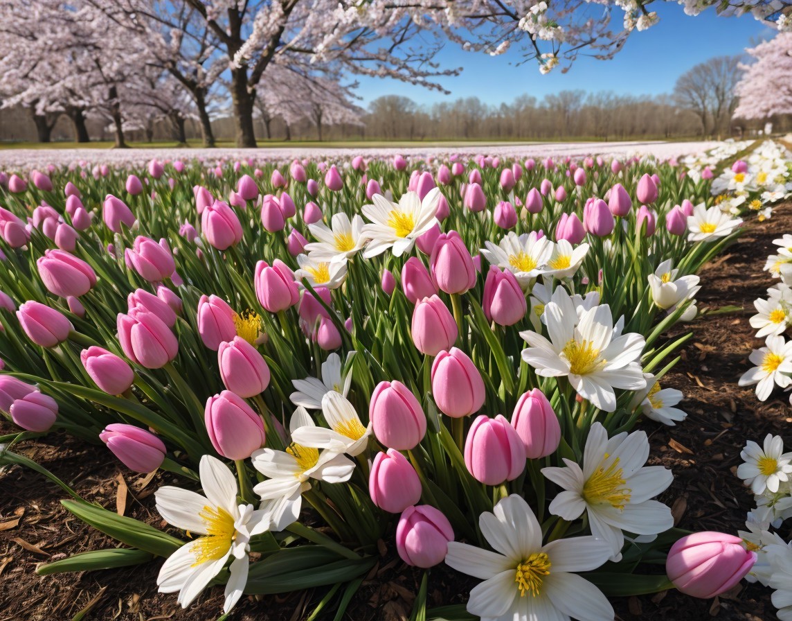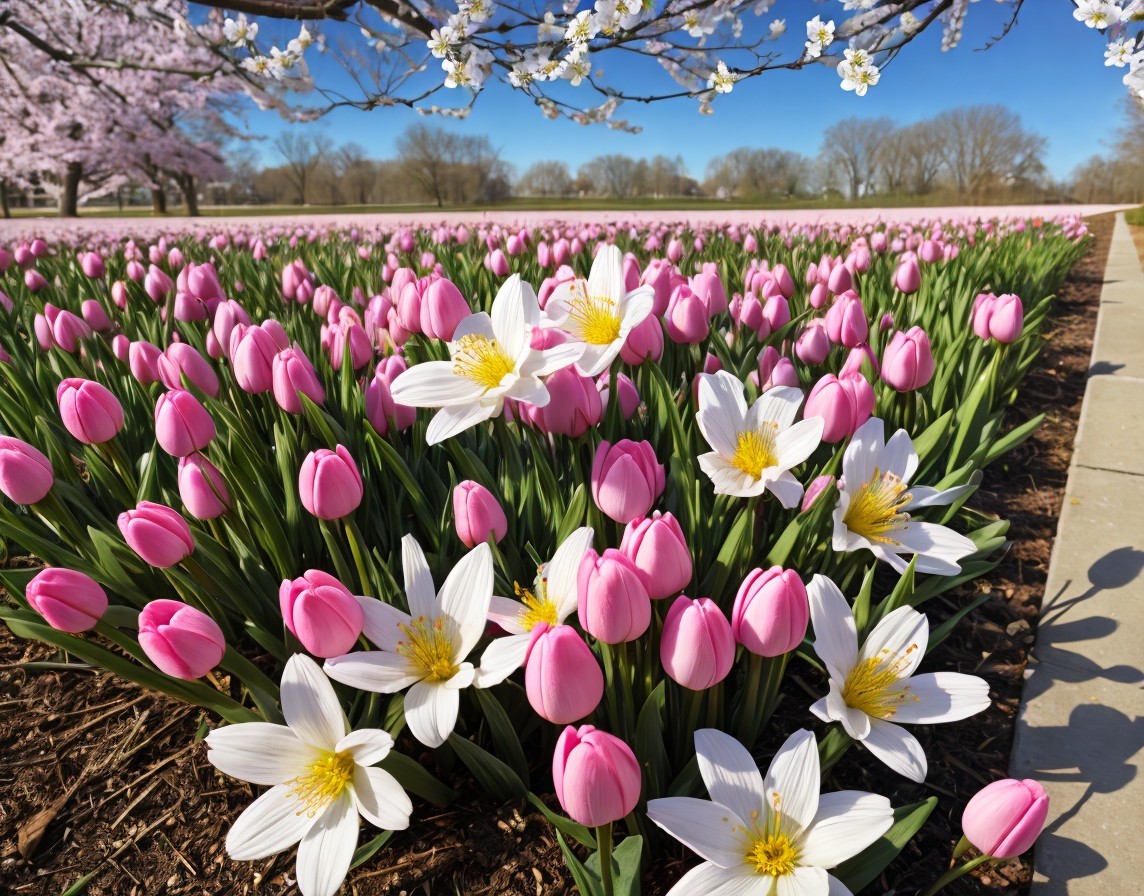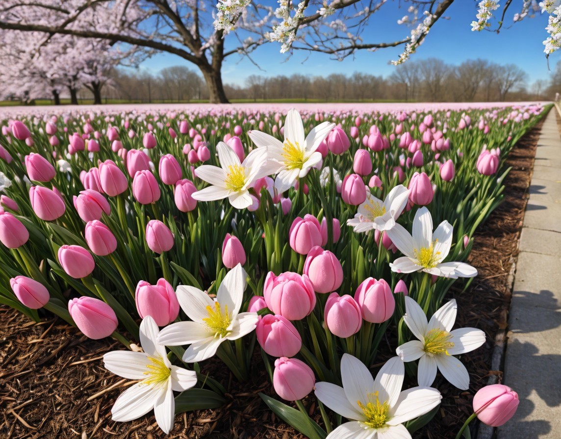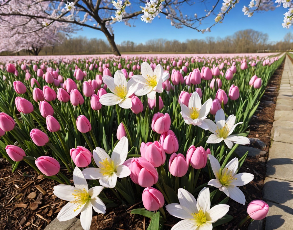 A vibrant display of pink tulips and white flowers lining a path under a clear blue sky with blossoming trees in the background.