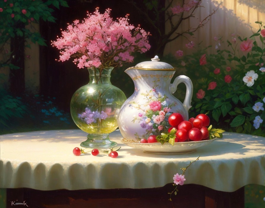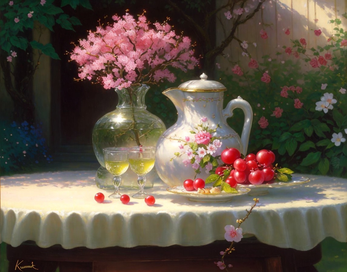 Prompt: "Une carafe ventrue, en verre couleur blanche, contenant des cerises, posée sur une table, dans un jardin fleuri avec des cerisiers du japon ."
