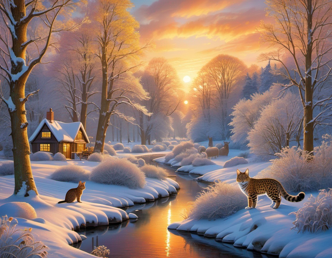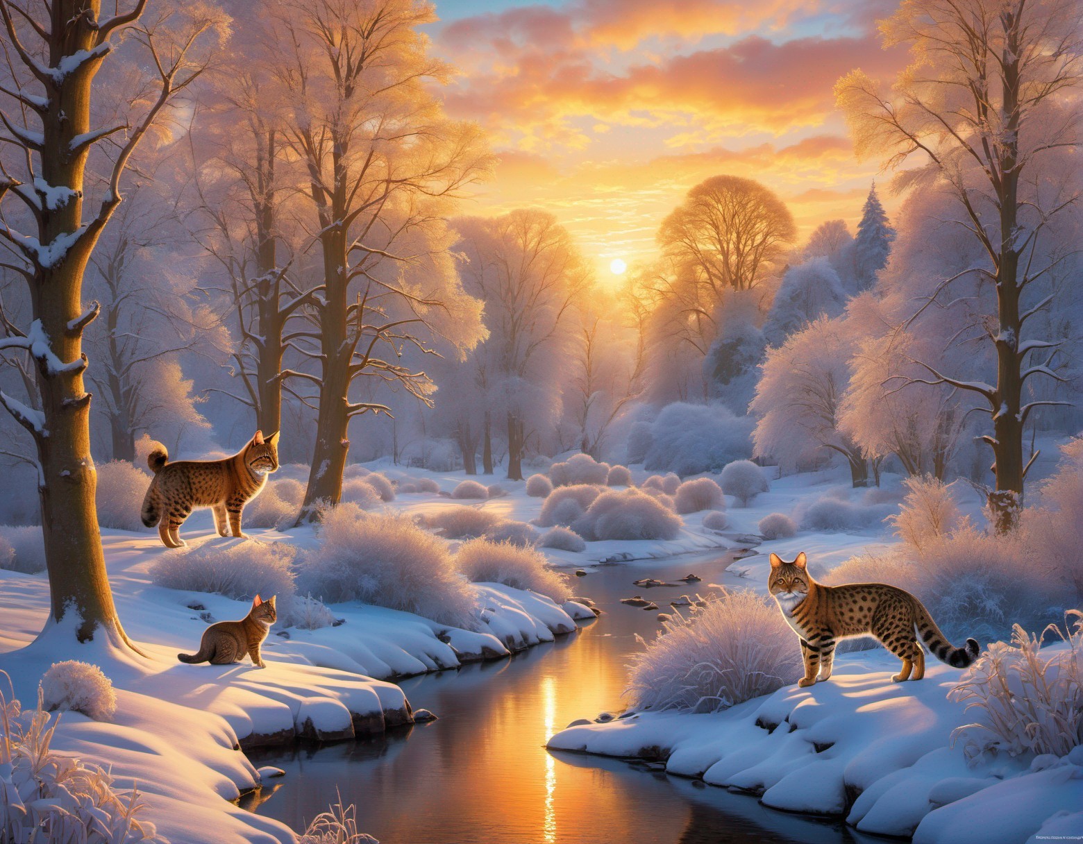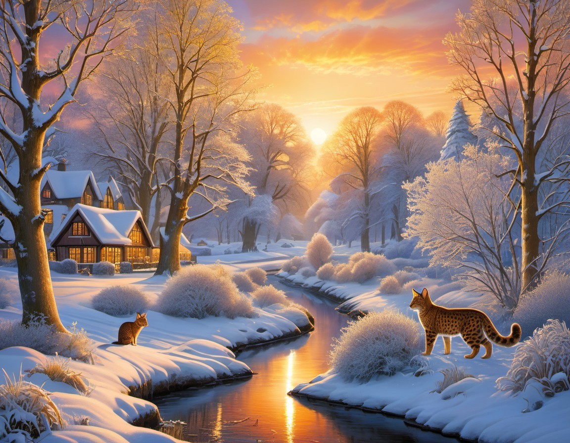 Winter Sunset Landscape with Lynxes by Stream