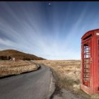 A lone figure stands beside a red telephone booth in a desolate landscape, gazing up at the expansive night sky, where the Milky Way stretches brightly above a distant mountain range.