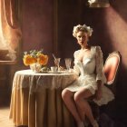 A woman sits elegantly at a table adorned with flowers and candles, surrounded by a mystical ambiance featuring hanging bats and soft lighting, creating an enchanting yet eerie atmosphere.