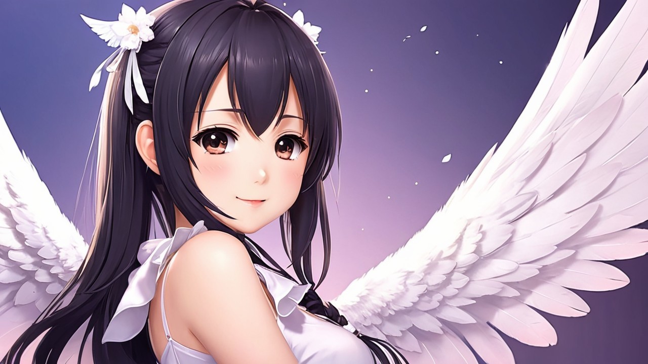 A charming anime girl with delicate, colorful wings stands gracefully, embodying a blend of innocence and strength. Her bright eyes sparkle with curiosity, and her whimsical outfit complements her enchanting presence.