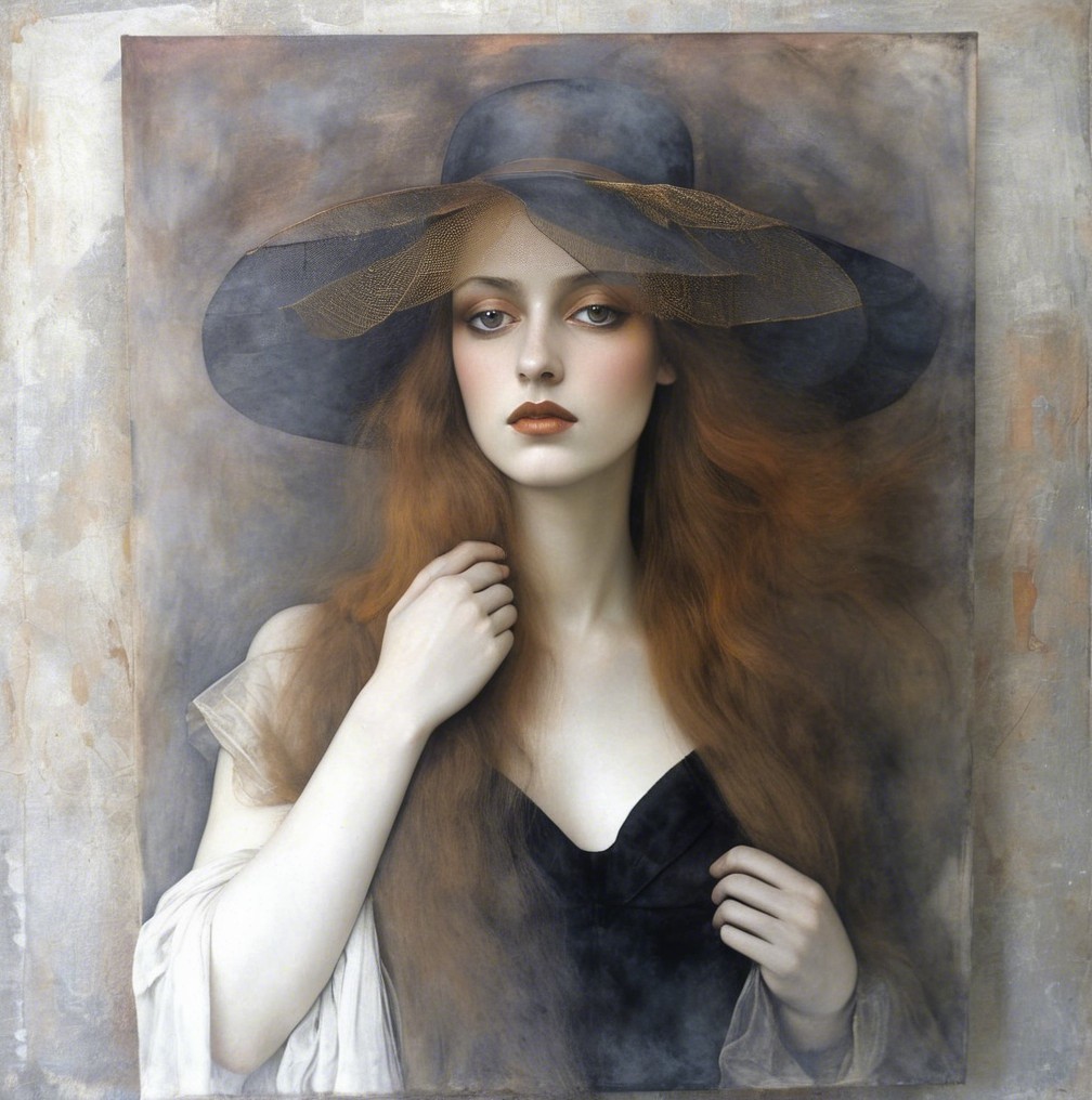 A stunning portrait of a woman with long, wavy red hair and a wide-brimmed black hat. She exudes an air of mystery, with soft, ethereal lighting and a smoky background enhancing her beauty.