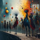 A surreal landscape features elongated figures with vibrant hairstyles and colorful balloons, walking along a stone pathway. The atmosphere blends whimsy with an eerie undertone, surrounded by dramatic scenery.