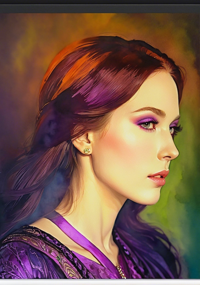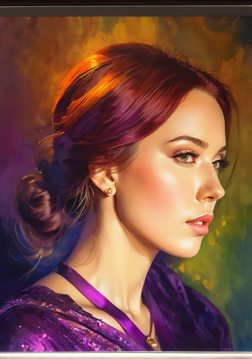 A stunning portrait of a woman with rich auburn hair styled elegantly. She wears a purple garment, with warm light highlighting her radiant skin and thoughtful expression against a colorful backdrop.