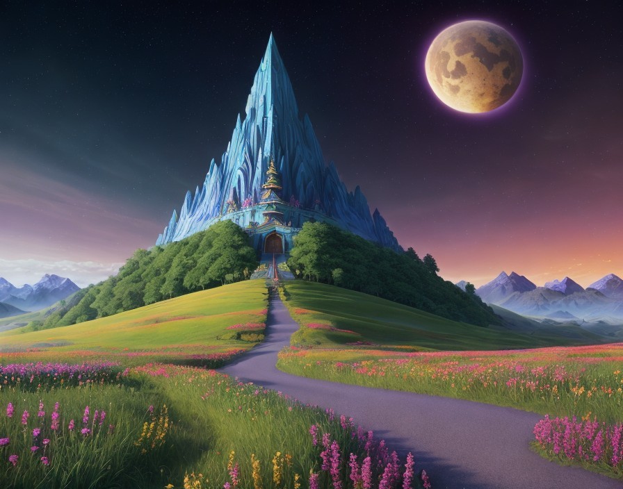 Prompt: "A gorgeous landscape of self-discovery, symbolic and mythological, the road to Shambhala with all of it's quirks and perils, Buddhist iconographic motives blended with Nicholas Roerich imagery distilled through the psychedelic crystal of Alex Gray and surrealism of Roberto Matta."