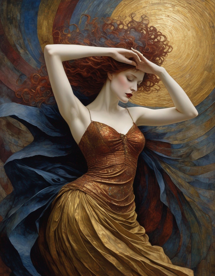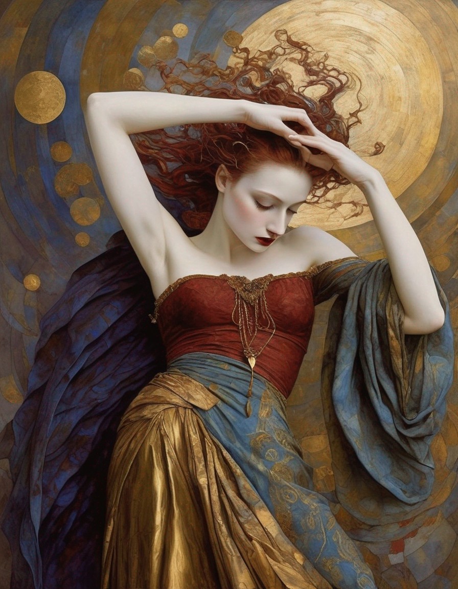 Red-haired woman in burgundy dress reaching for golden disc in mystical forest