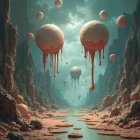 A surreal landscape featuring towering, jagged formations and floating orbs. The scene is bathed in warm red and orange hues, creating an otherworldly, dreamlike atmosphere.