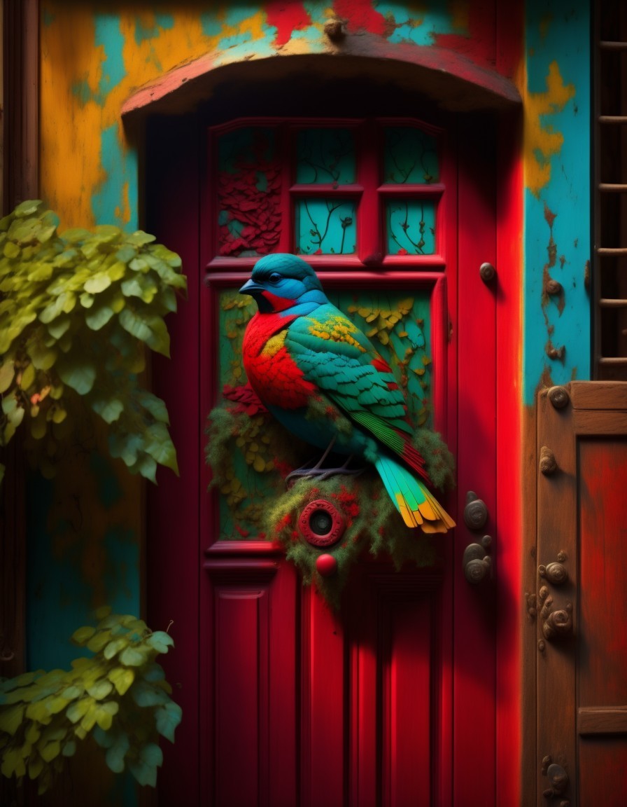 Prompt: a very beautiful masterpiece, the old house is covered with burgundy ivy, patina, an old cracked window, a door, a beautiful bird sits above the door.