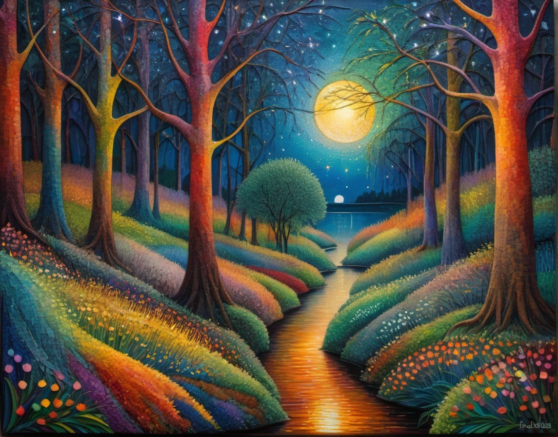Vibrant Dreamlike Night Landscape with Trees and River