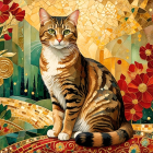 Vibrant Illustration of a Tabby Cat with Flowers