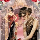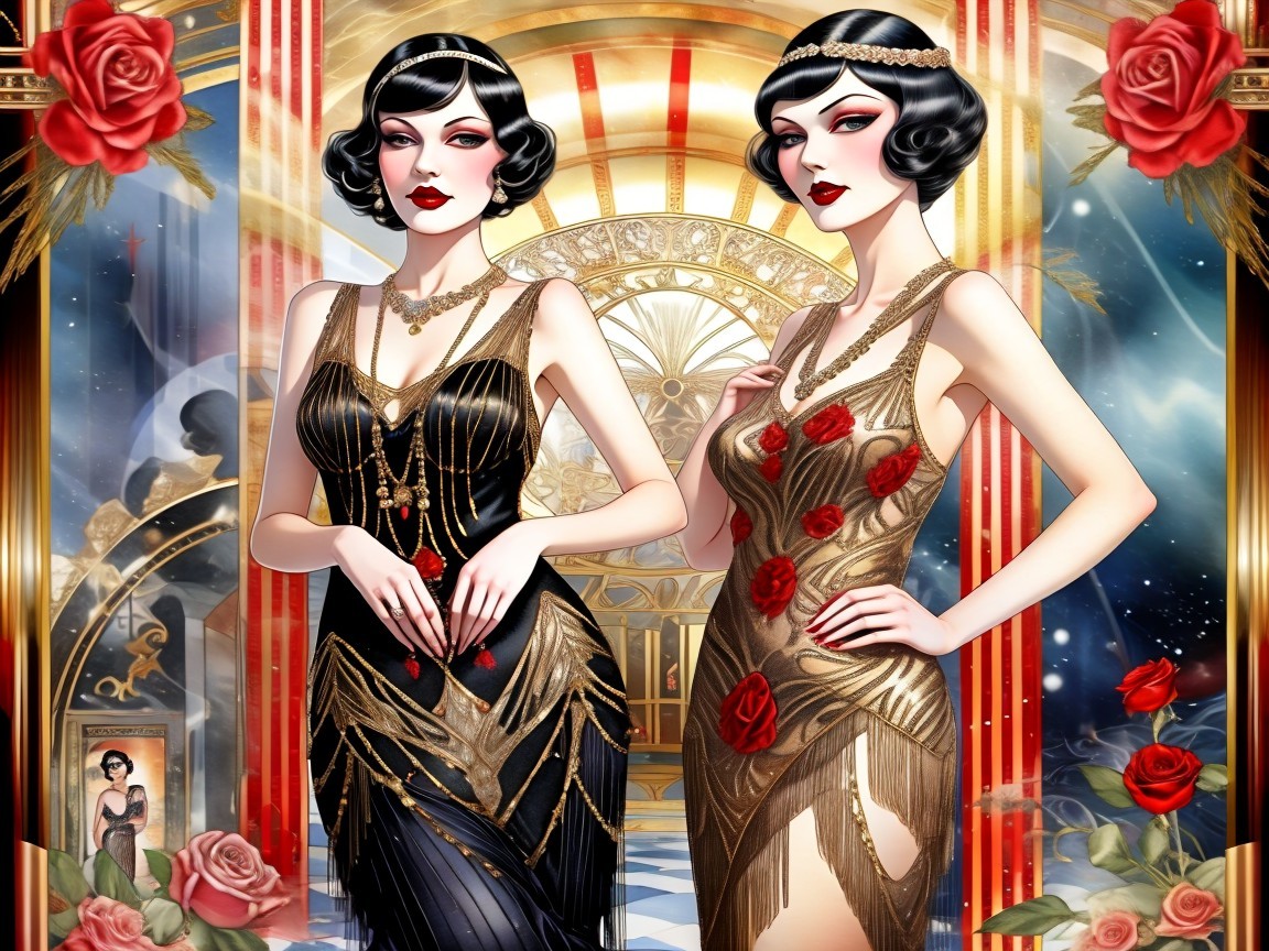 Two elegant women in 1920s flapper dresses—one in gold and the other in red—adorned with pearls and stylish headbands, stand gracefully against an Art Deco background.