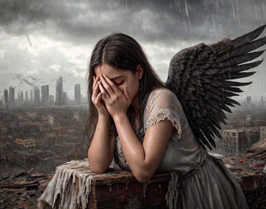 A somber angel with black wings sits in rain over a desolate cityscape, her face buried in her hands, exuding distress.