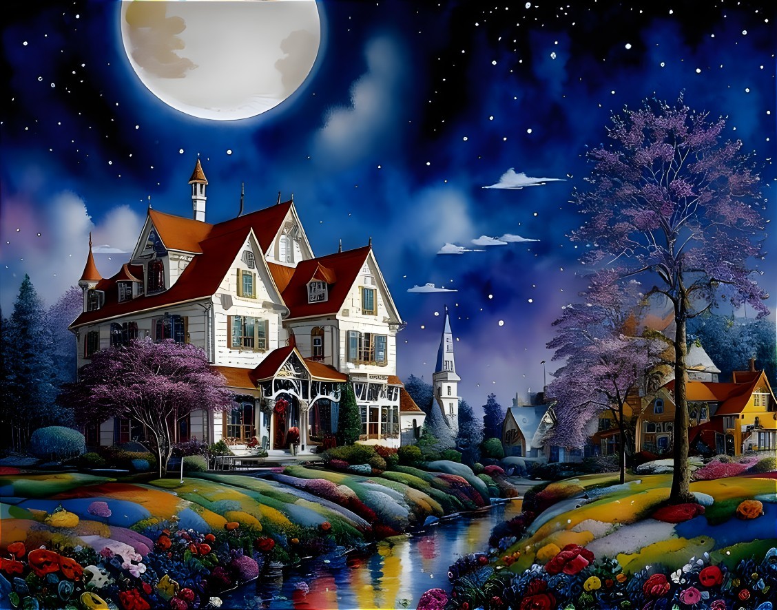 A whimsical village at night with a full moon, vibrant gardens, colorful houses, and a serene stream under a starry sky.