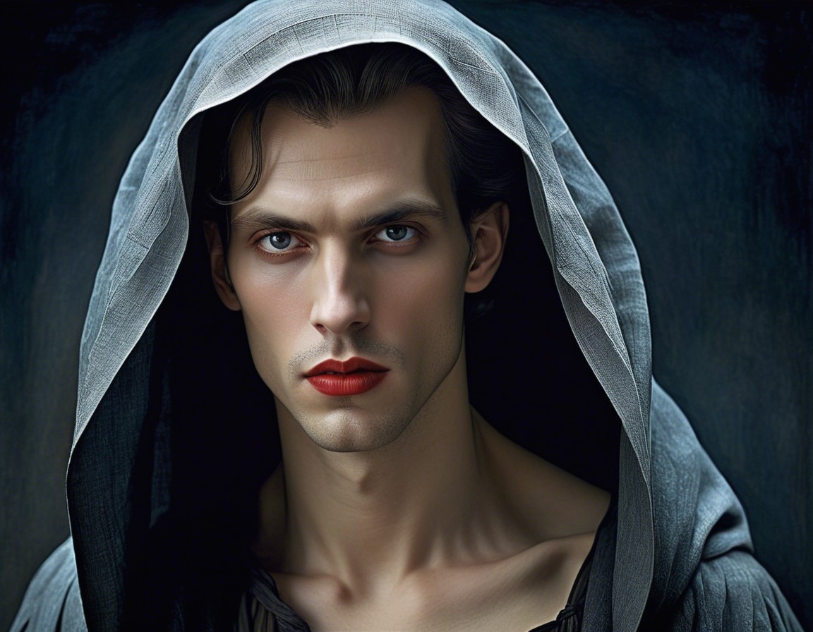 A striking portrait of a young man in a dark hooded garment. His intense gaze and bold red lips create a captivating contrast against the muted background, evoking an air of mystery.